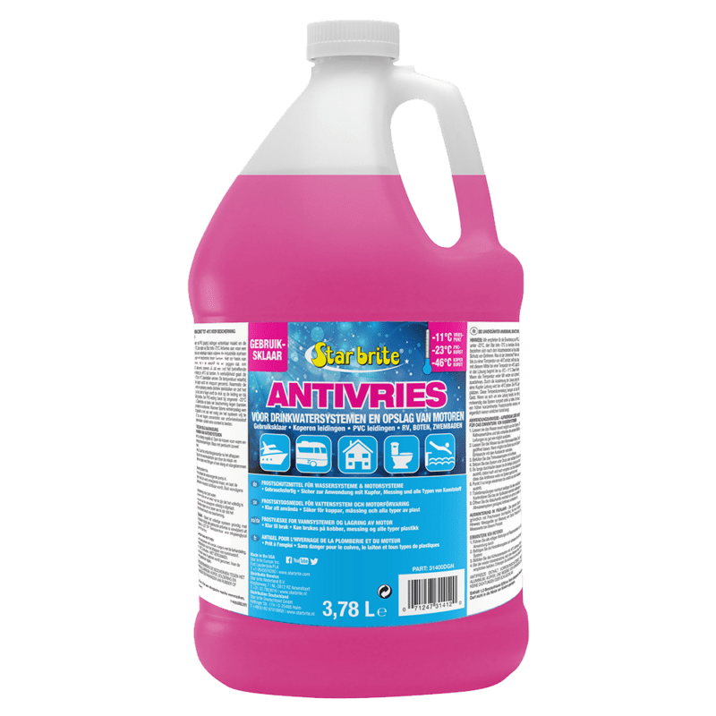 Star brite Antivries voor Drinkwatersystemen en Opslag van Motoren biedt bescherming tegen bevriezing voor watersystemen en motoren tijdens de winterstalling. Deze antivries bevat anticorrosiemiddelen die alle metalen onderdelen en afdichtingen beschermen, en is gebaseerd op propyleenglycol, veilig voor koper, messing en kunststof. Onverdund biedt het bescherming tot -46 °C en voorkomt dat leidingen barsten door de kou. Het is geschikt voor gebruik in boten, campers, caravans, vakantiehuizen en zwembaden, en biedt een betrouwbare oplossing voor het winterklaar maken van diverse voertuigen en machines.