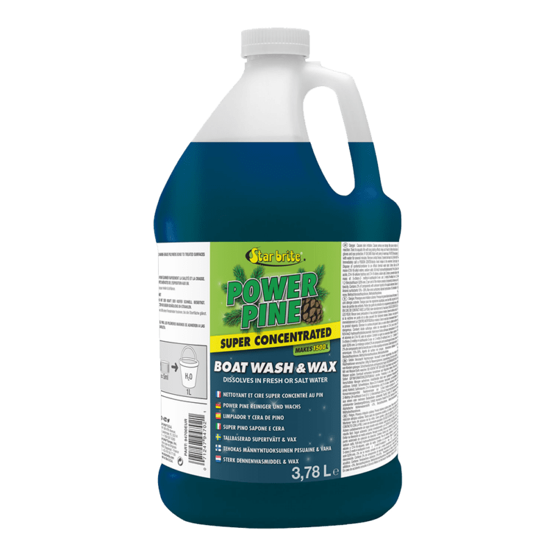 Voor het beste resultaat, gebruik wanneer het oppervlak van de boot koel is om aan te raken. Meng 2 dopjes Power Pine Wash & Wax per 4 liter water voor een lichte schoonmaak; gebruik 4 dopjes per 4 liter voor zwaardere schoonmaakklussen. Breng aan met een doek, spons of een dekborstel. Schrob indien nodig en spoel af. Droog met een zeemleer (chamois) om de glans te onthullen.